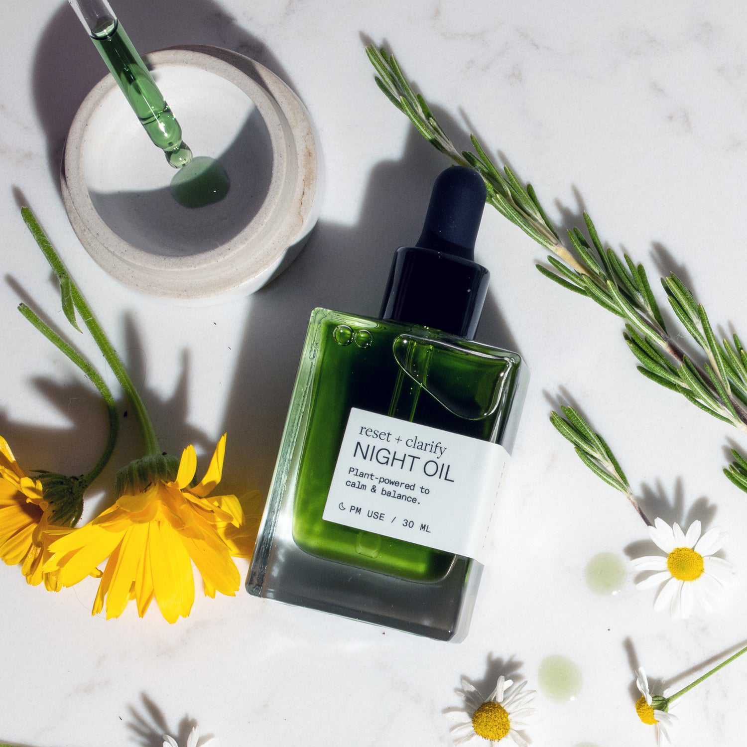 A calming, restorative night oil designed for sensitive, oily, and acne-prone skin. Powered by balancing jojoba, clarifying black cumin seed, and barrier-repairing tamanu, this nutrient-rich blend helps reduce redness, calm inflammation, and promote a clear, healthy glow. Botanical infusions of green tea, centella, chlorella, and arnica offer antioxidant and healing support, while blue chamomile, blue tansy, and calendula soothe irritation. With gentle retinol-alternative babchi and skin-strengthening vitamins E and D3, this nightly treatment helps reset, rebalance, and renew your skin while you sleep.